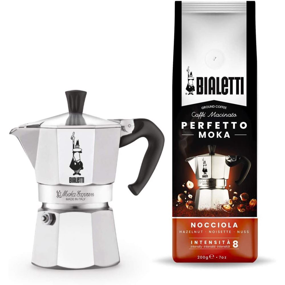 Set Bialetti format dintr-un Espressor Bialetti Moka Express de 6 cesti si o punga de 200 gr. Cafea Bialetti macinata pentru moka cu aroma de alune, ideal pentru a fi oferit cadou celor dragi.