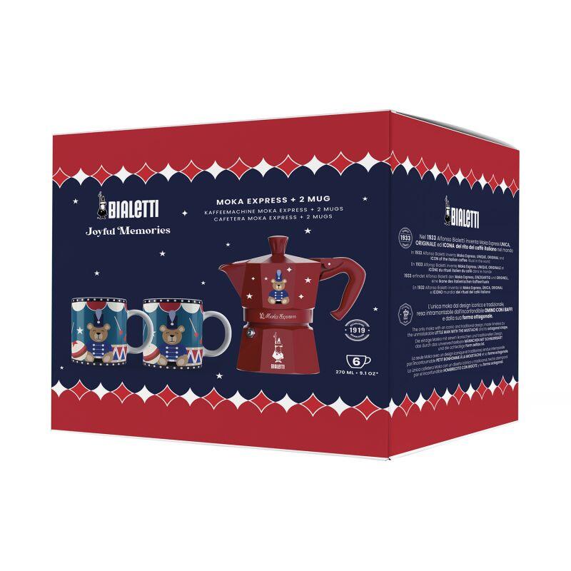 Set Bialetti Joyful Christmas, format din Moka Express 6tz și două căni ceramice de 300 ml.